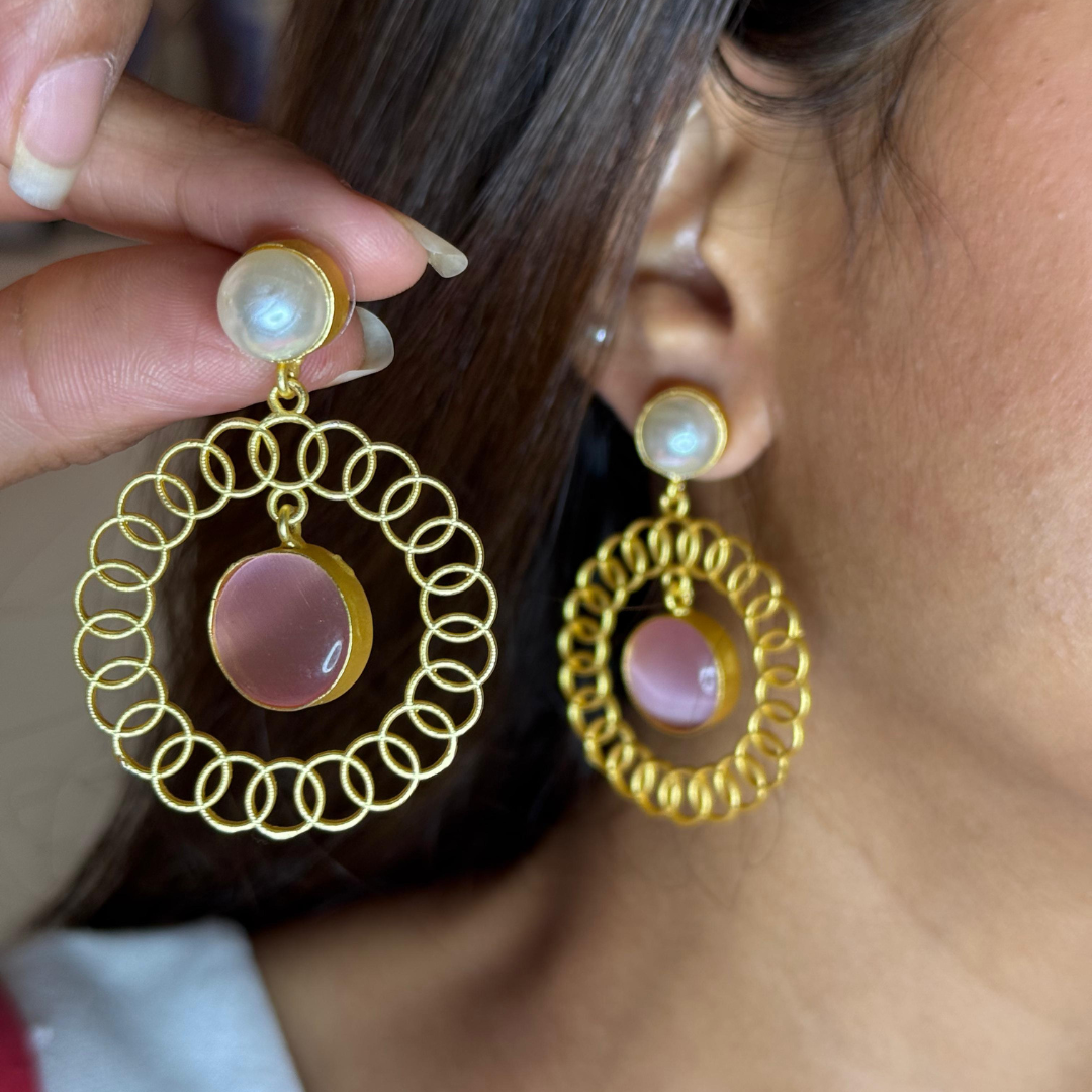 The Blush Halo earrings combine soft elegance with bold design. A luminous pearl stud holds a delicate gold spiral hoop, centered with a blush pink stone. These earrings are romantic, graceful, and ideal for daytime glamour or brunch dates.