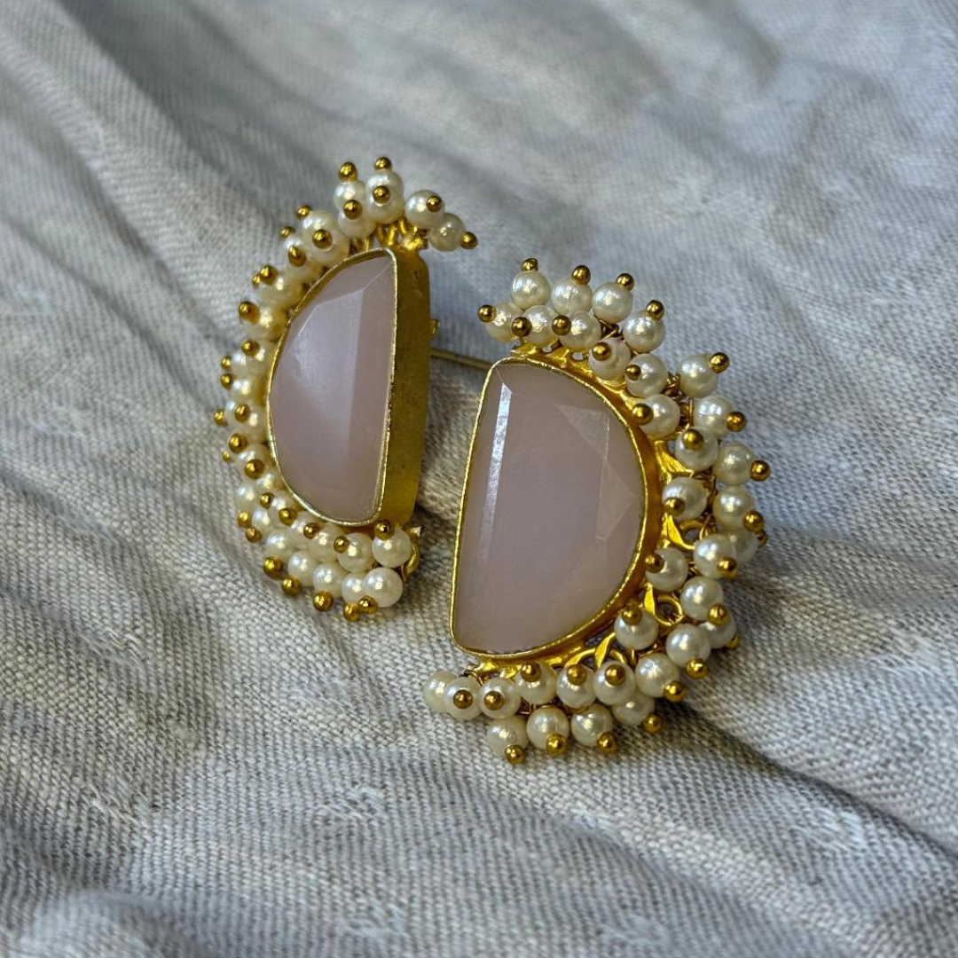 Blush-toned stones haloed in pearls form these soft yet striking crescent studs — graceful enough for day, bold enough for night.