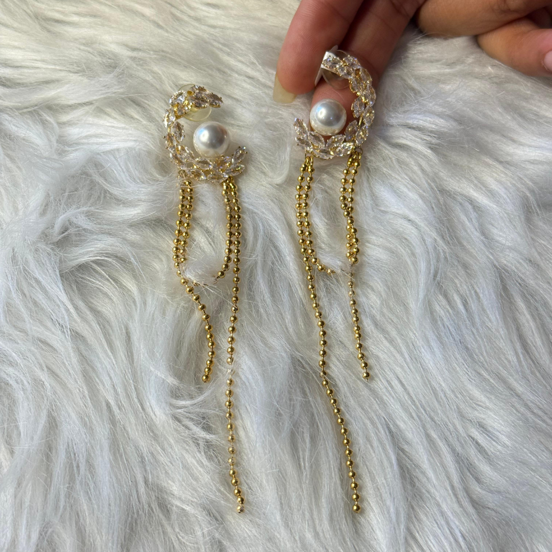 Inspired by cosmic beauty, the Celestial Drip earrings feature a crescent stud embellished with clear crystals and a radiant faux pearl center. Gold beaded chain tassels cascade downward, creating movement and sparkle. Perfect for special occasions or star-studded evenings.