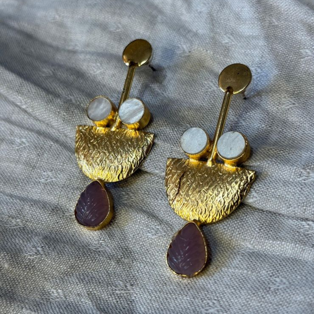 Textured gold fans meet moonlit circles and leaf-carved stones — an artistic blend of tradition and abstract charm.