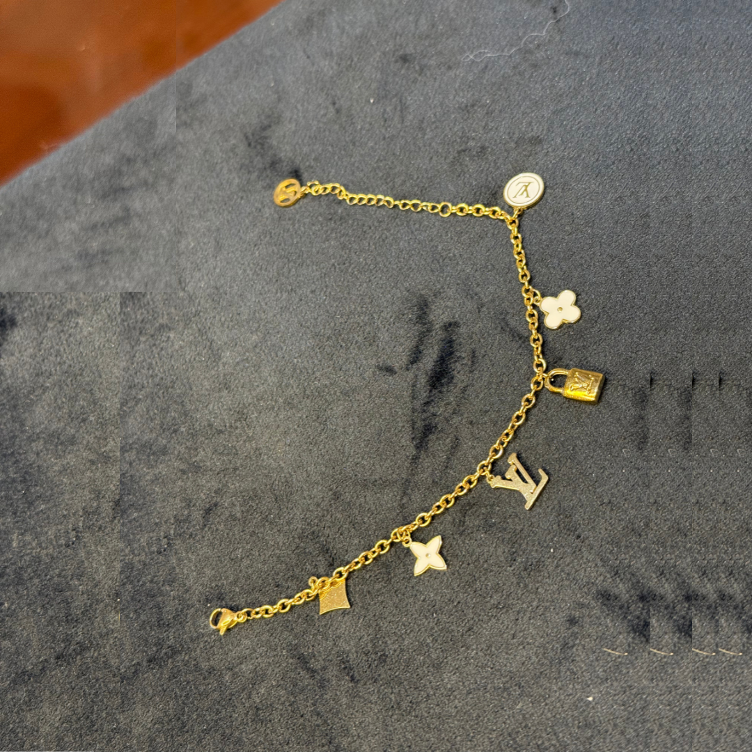 The bracelet is a delicate piece of jewelry featuring a series of interconnected links. It has a gold-tone finish, giving it a luxurious appearance. Decorative elements include iconic symbols, possibly related to a well-known brand, interspersed with floral motifs, likely resembling stars. The segments are complemented by small, sparkling stones that add a touch of glamour.