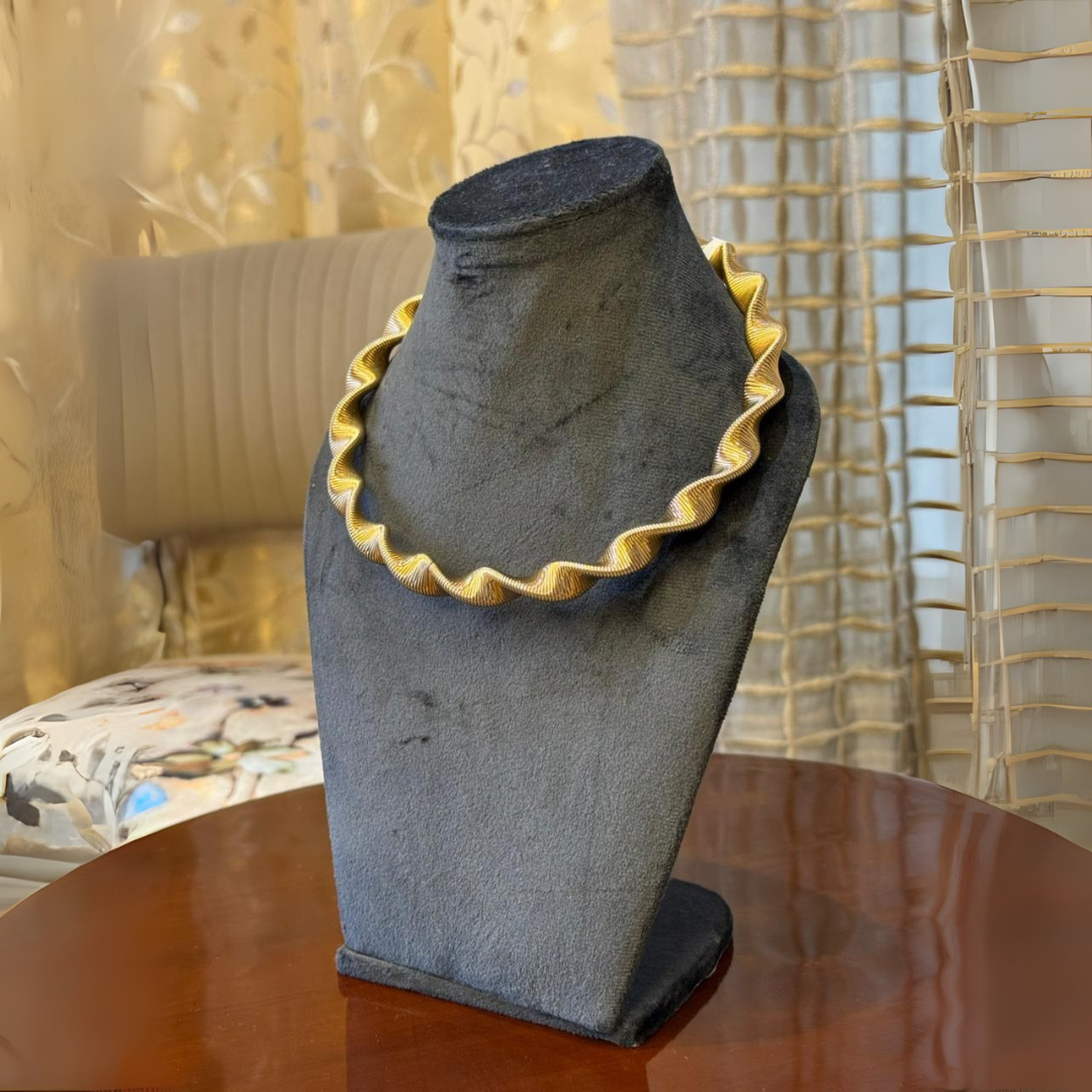 What makes this necklace a statement piece? Make a bold statement with our Modern Golden Choker. This striking piece features a wide, impeccably polished gold-tone band, distinguished by its unique ribbed texture that beautifully catches and reflects light. Designed to sit elegantly around your neckline, it’s a piece that exudes contemporary glamour and confident style, perfect for elevating any outfit. Material : Alloy (Anti-tarnish) Size : Adjustable Length Color : Golden How can you style this necklace? This Modern Golden Choker is a statement piece perfect for elevating various necklines. Pair it with an open collar, V-neck, or strapless top to let its bold, ribbed design shine. It adds instant contemporary glamour, transforming simple outfits into chic ensembles.