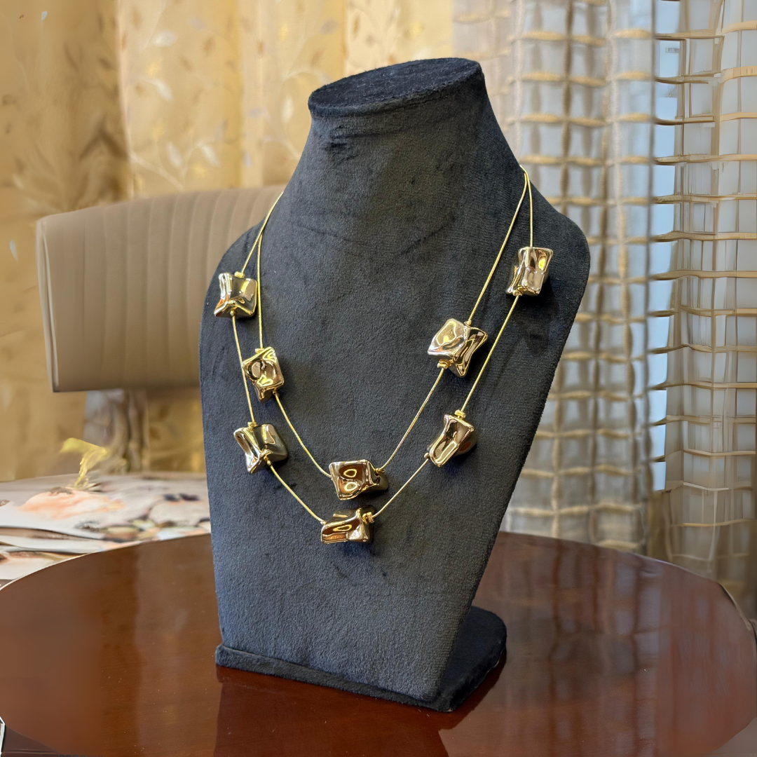 Unleash bold elegance with the Molten Charm Statement Necklace, featuring irregular gold-tone sculptural beads strung on dual fine wires. This modern art-inspired piece stands out with its fluid, organic forms, exuding a powerful, fashion-forward aesthetic.